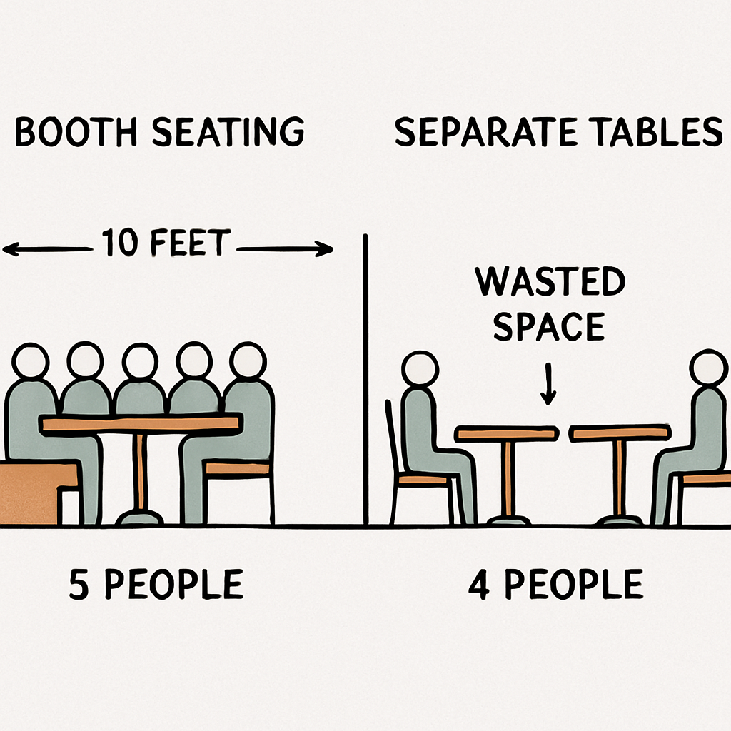 A simple side-by-side diagram. Left side: A 10-foot wall section with a booth seating 5 people. Right side: The same 10-foot section with two separate tables, showing wasted space between them and the larger footprint required for chair push-back, seating only 4 people