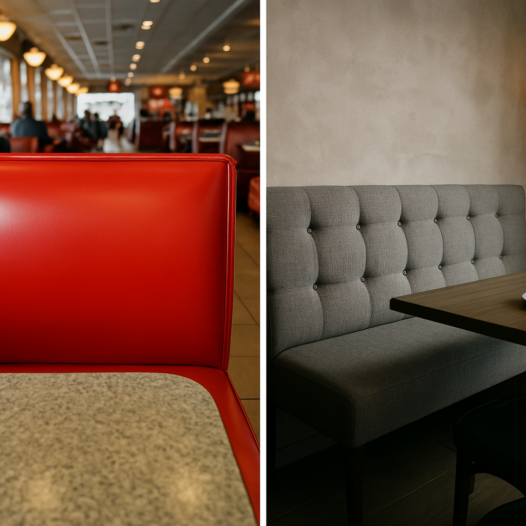 A clear, side-by-side photo. Left: A bright, easy-to-clean red vinyl booth in a bustling family diner. Right: A sophisticated, textured grey fabric banquette in a quiet, upscale cafe