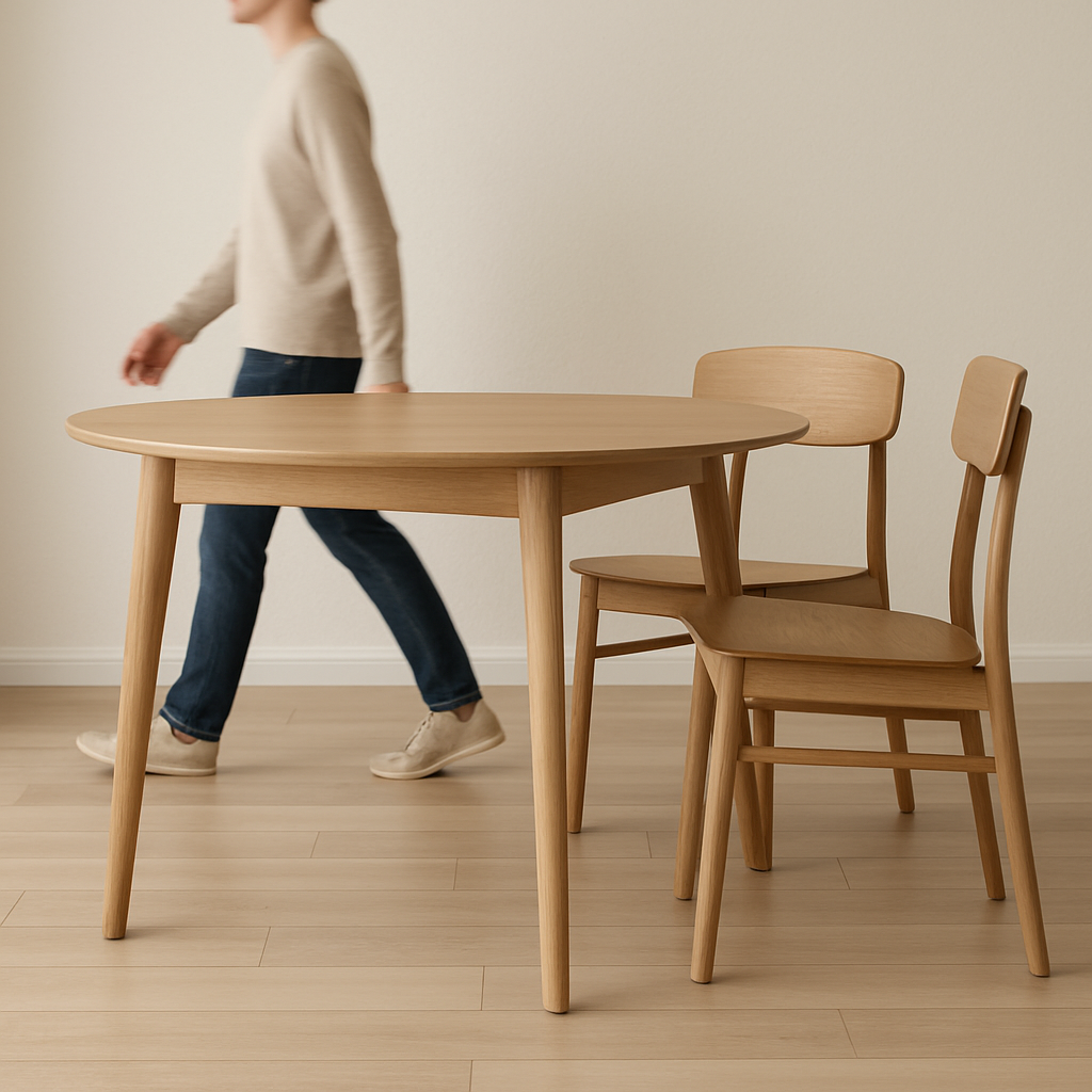 A clear photo of the Eugene dining table in a room. A person is comfortably walking behind a pulled-out dining chair, visually illustrating the concept of clearance space