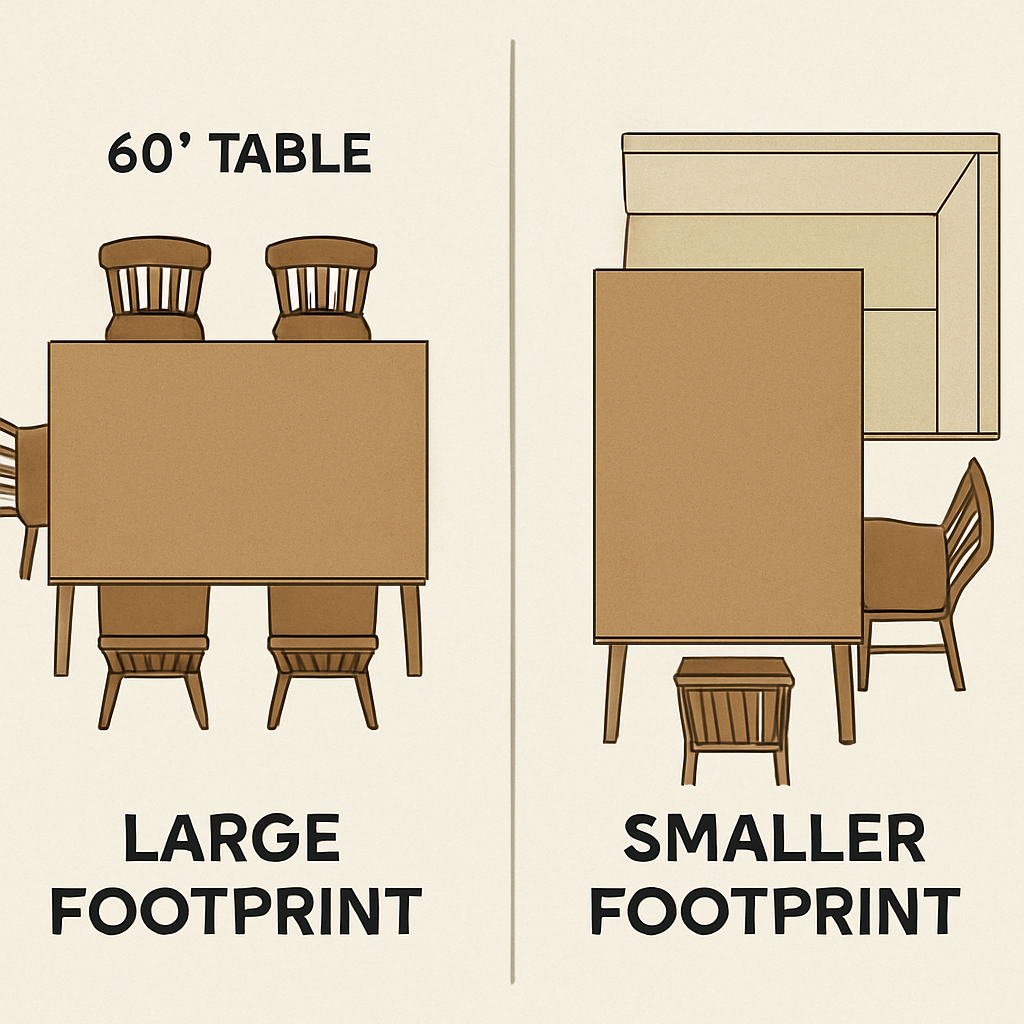 A simple side-by-side comparison graphic. On the left, a 60-inch table with 4 dining chairs pulled out, showing a large footprint. On the right, the same 60-inch table with a banquette on one side and two chairs on the other, showing a much smaller, tidier footprint