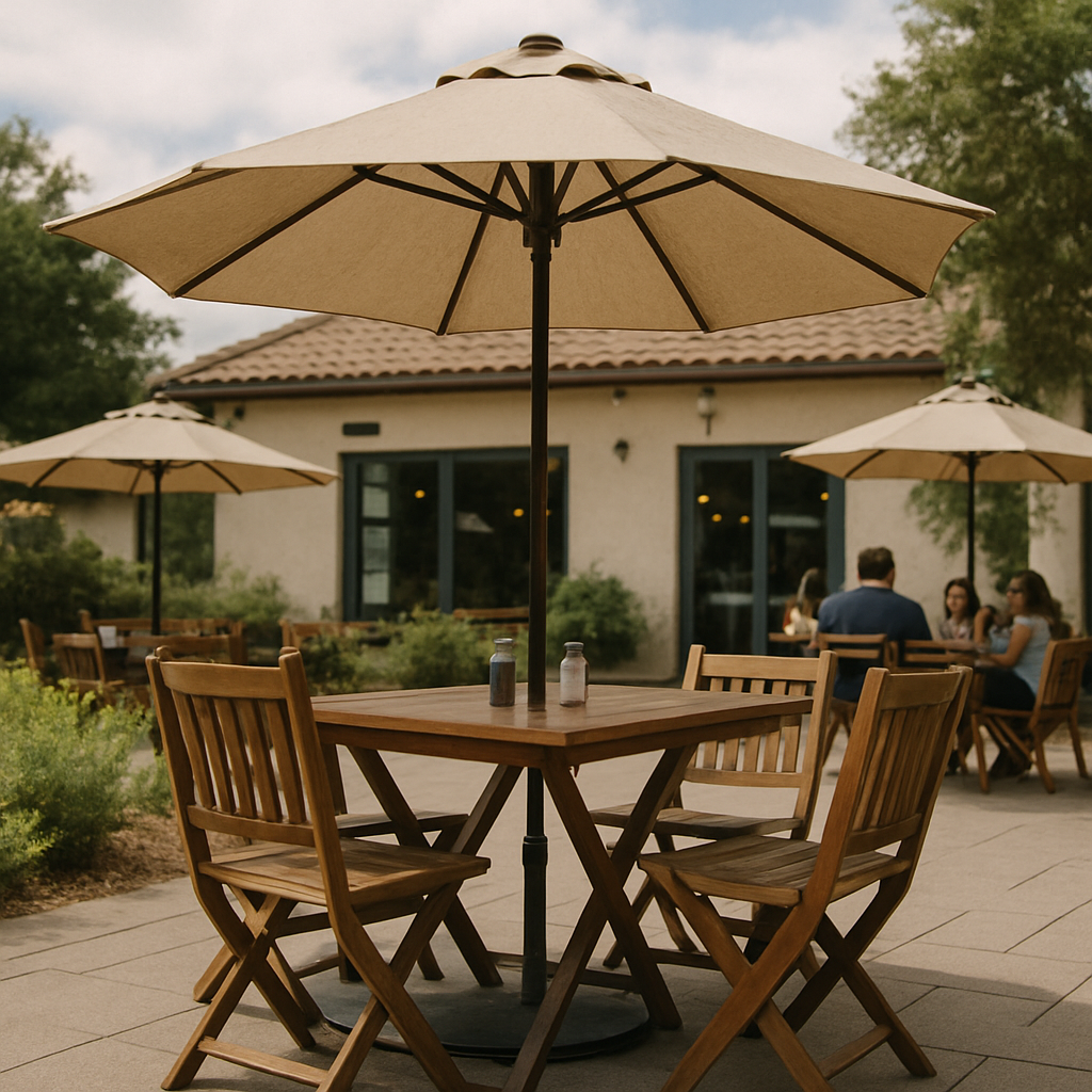 Aesthetic Appeal: A well-coordinated patio dining set can enhance the visual appeal of your outdoor space, making it more inviting. Matching furniture with vibrant umbrellas can serve as a focal point, drawing attention and creating a cohesive look that complements your restaurant's theme.